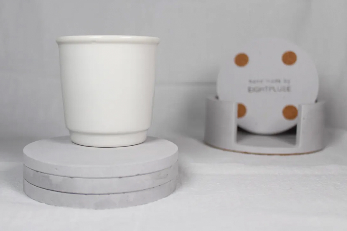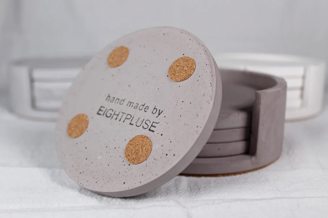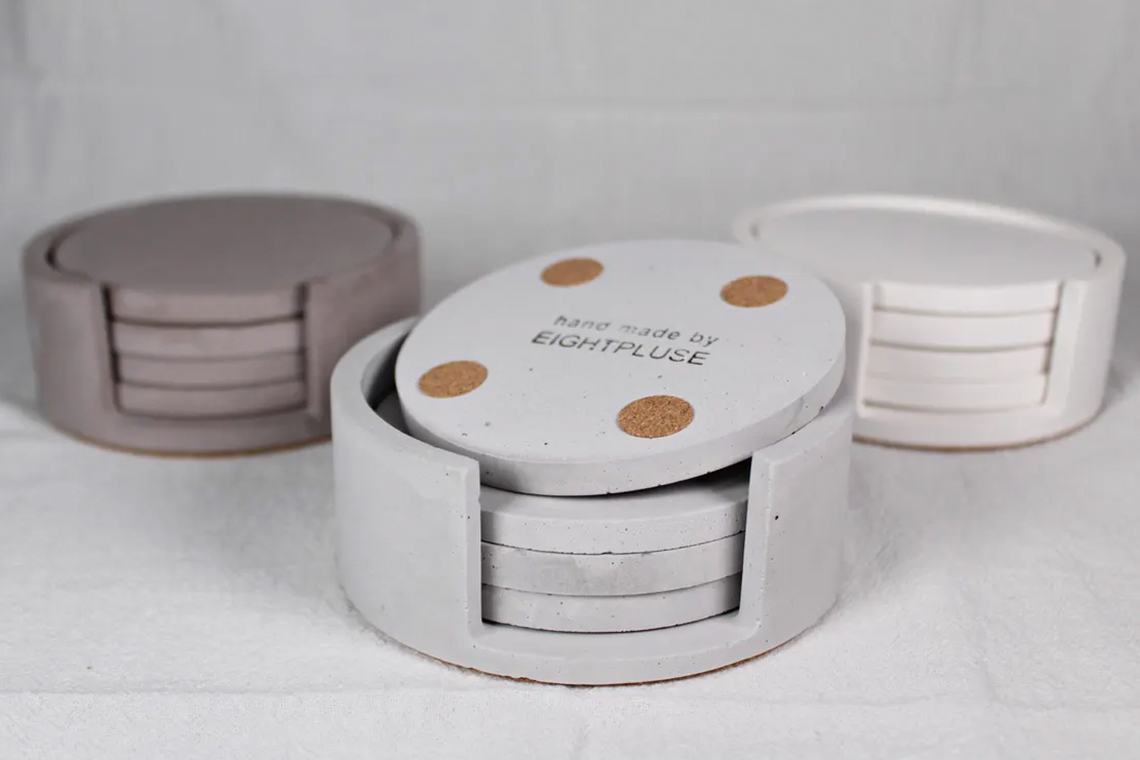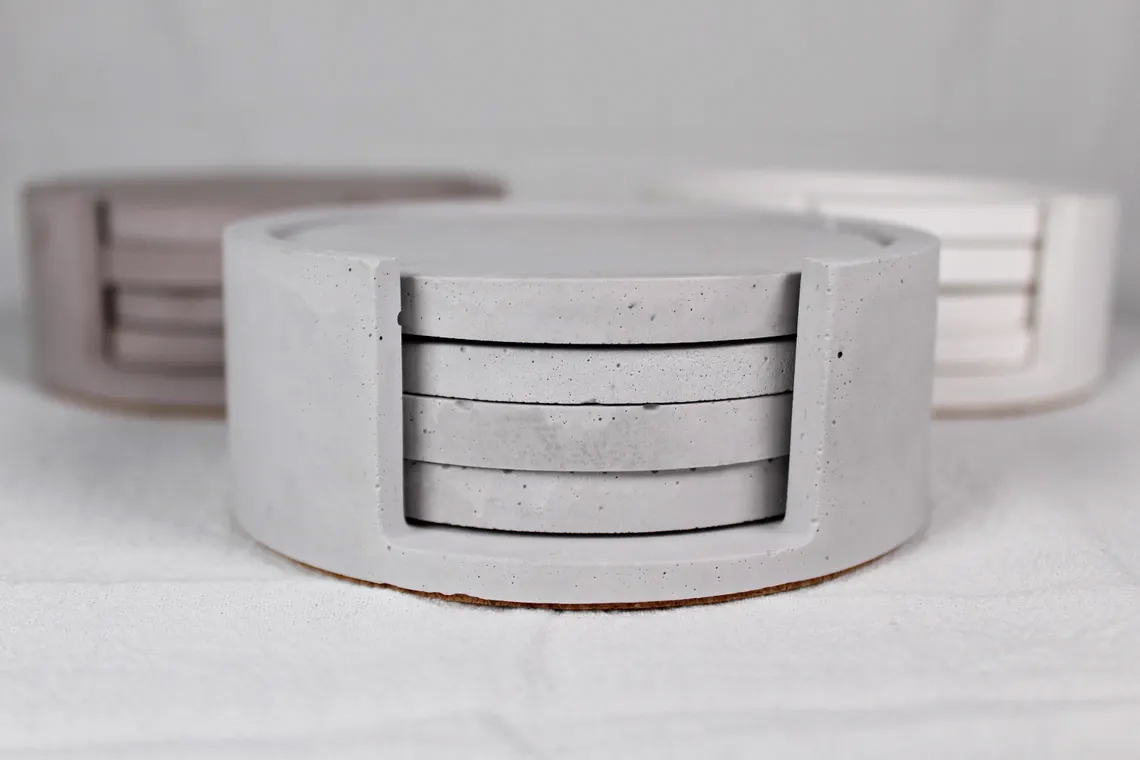 Captivating CONCRETE COASTERS with holder (set of 4) by EightPlusE