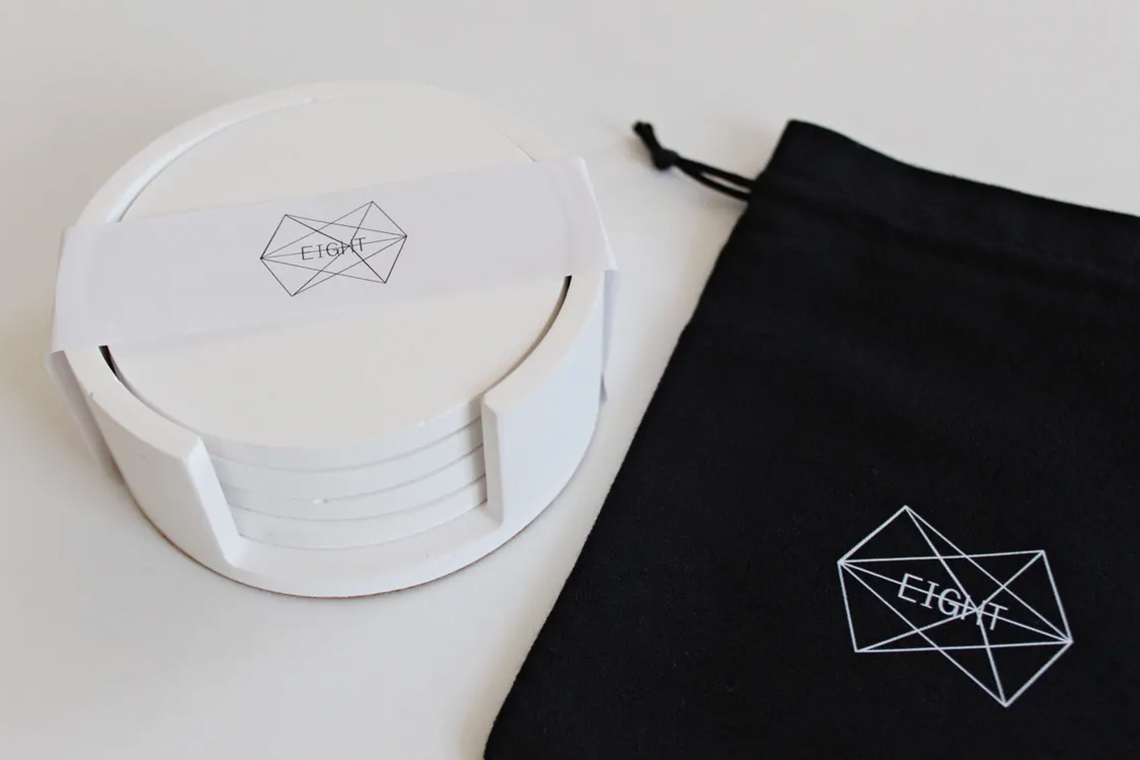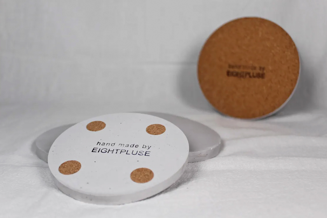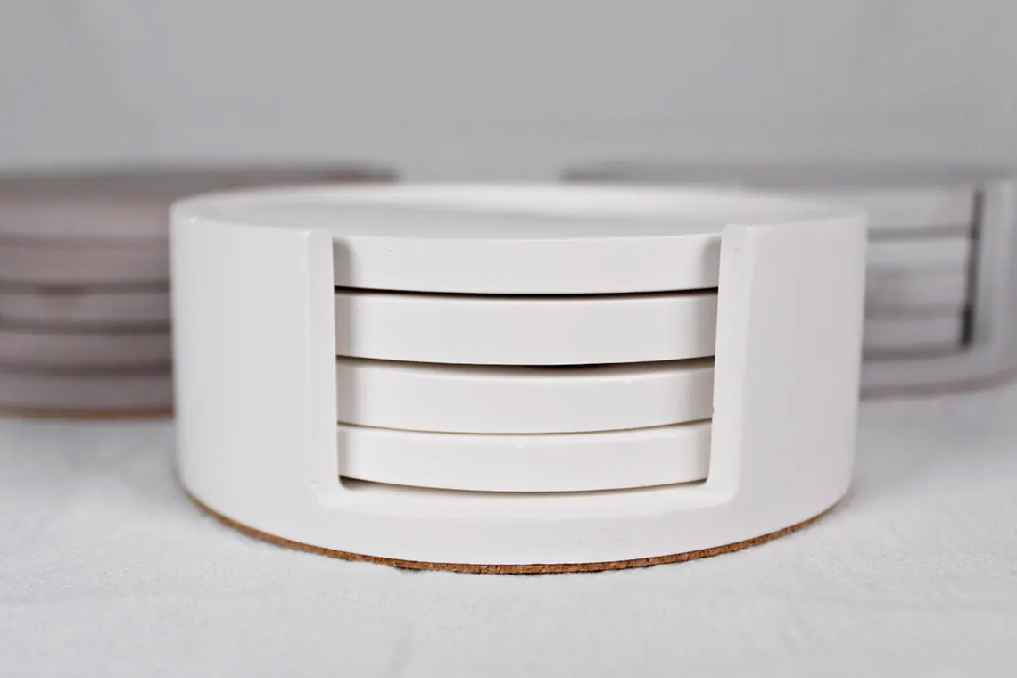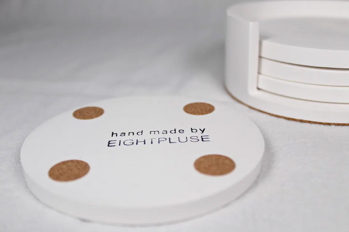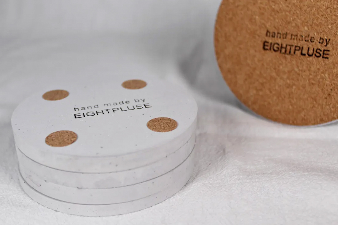 Captivating CONCRETE COASTERS with holder (set of 4) by EightPlusE