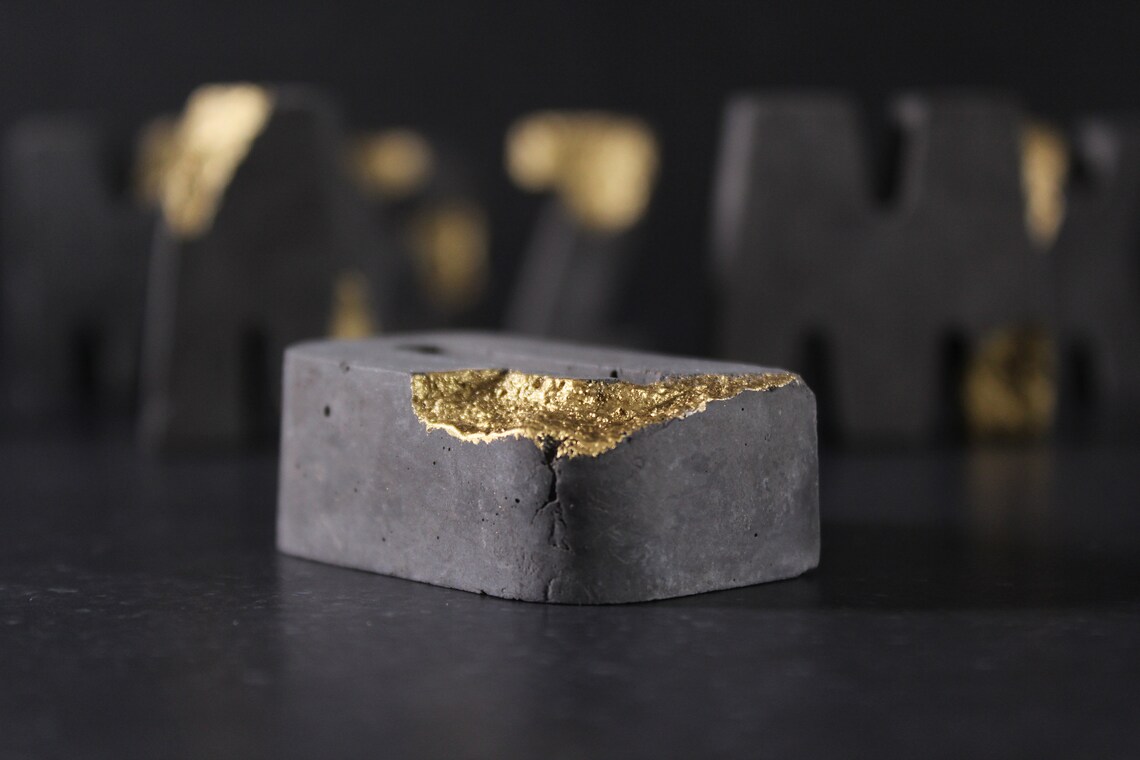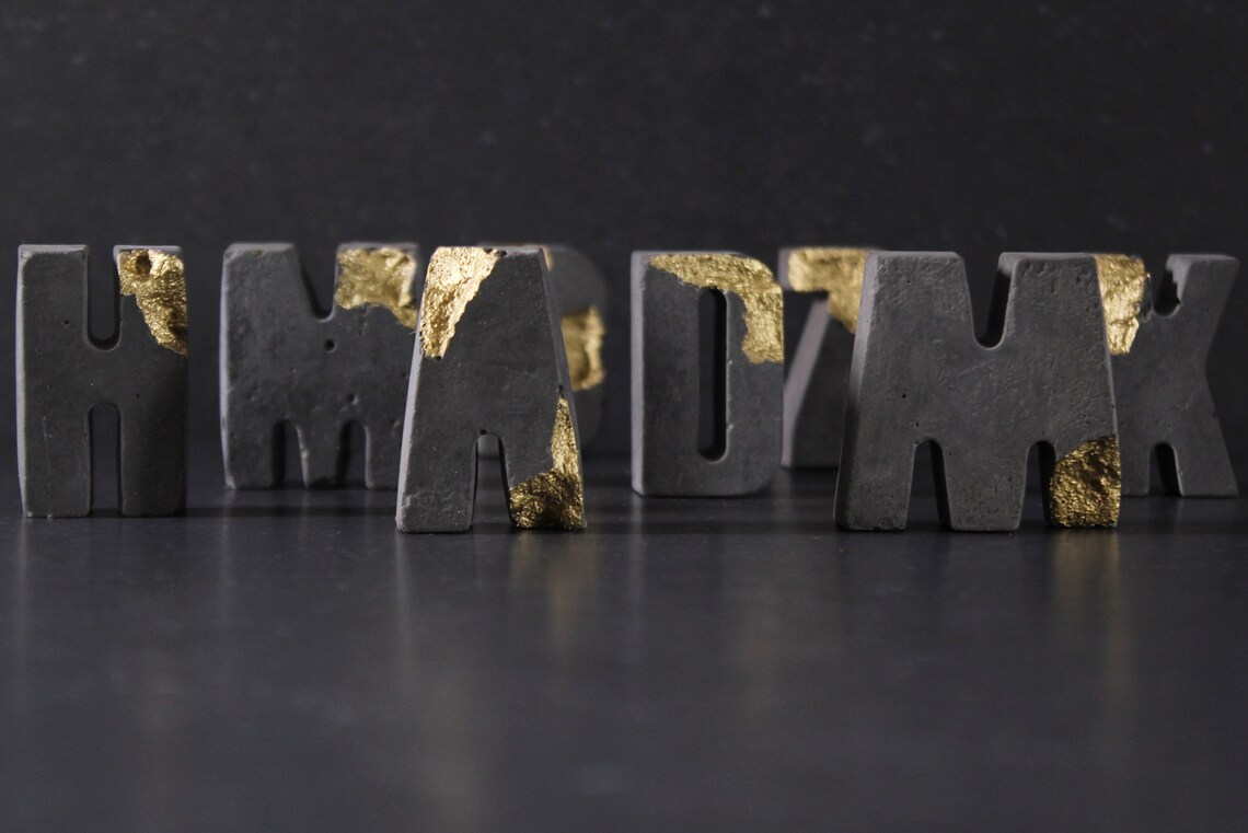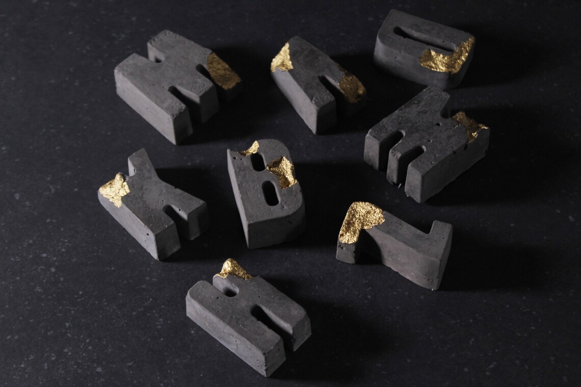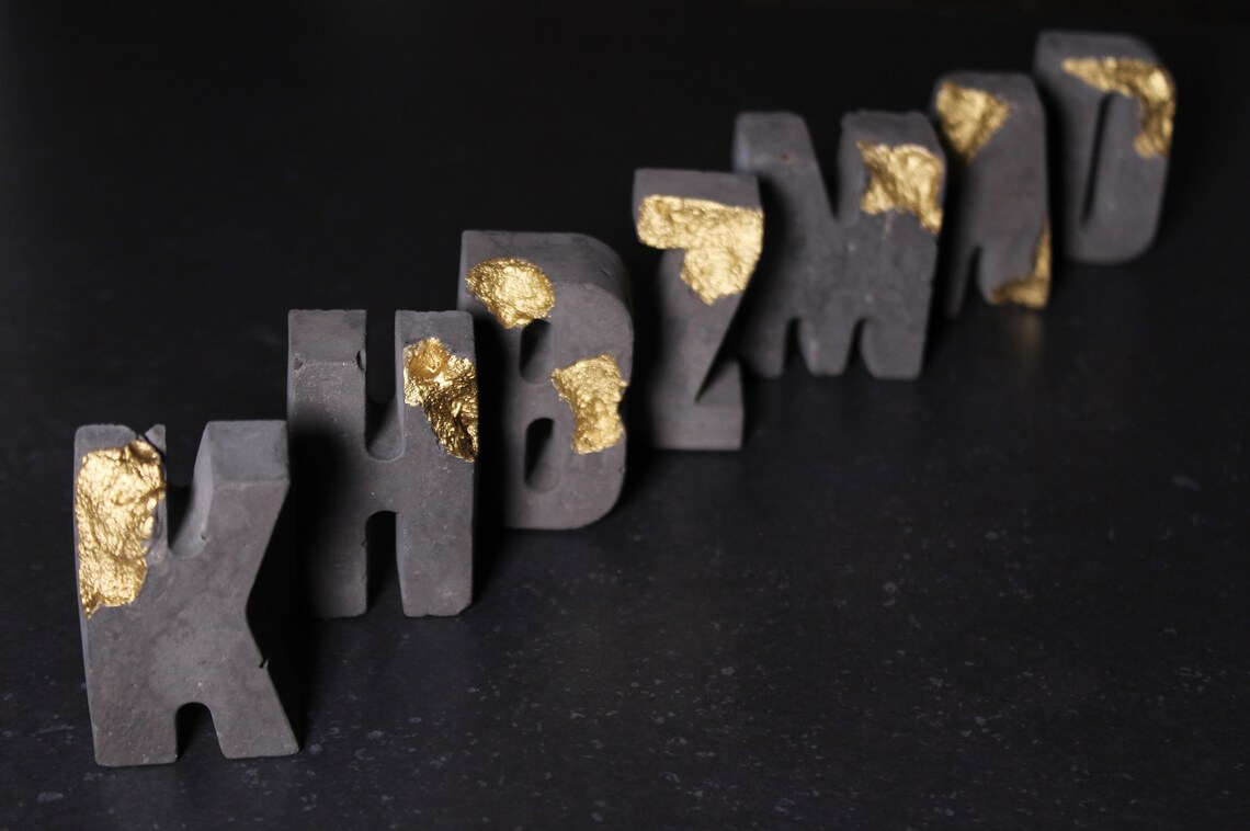 Charcoal relief concrete letters with gold by EightPlusE